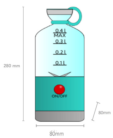 Charakterystyka: Wyciskarka do owoców jest w formie bidonu, co umożliwia jej przenośne wykorzystanie. Butelka składa się z tworzywa sztucznego PC w kolorze niebieskim. Na górze znajduje się metalowa zakrętka i gumowa rączka. W wewnątrz znajdują się ostrza, zbudowane ze stali nierdzewnej. W zestawie mieści się ładowarka bezprzewodowa w kształcie podstawki, na której stawia się butelkę w celu ładowania, podczas którego lampka wskaźnika miga na biało. Po naładowaniu lampka gaśnie. Podczas procesu ładowania nie można uruchomić produktu. Bateria bidonu starcza na 15 cykli blendowania. Na zewnątrz znajduje się przycisk włączenia wyciskarki. Urządzenie to umożliwia zrobienie soków z winogron, truskawek, arbuza, malin, gruszek, pomidorów itp.